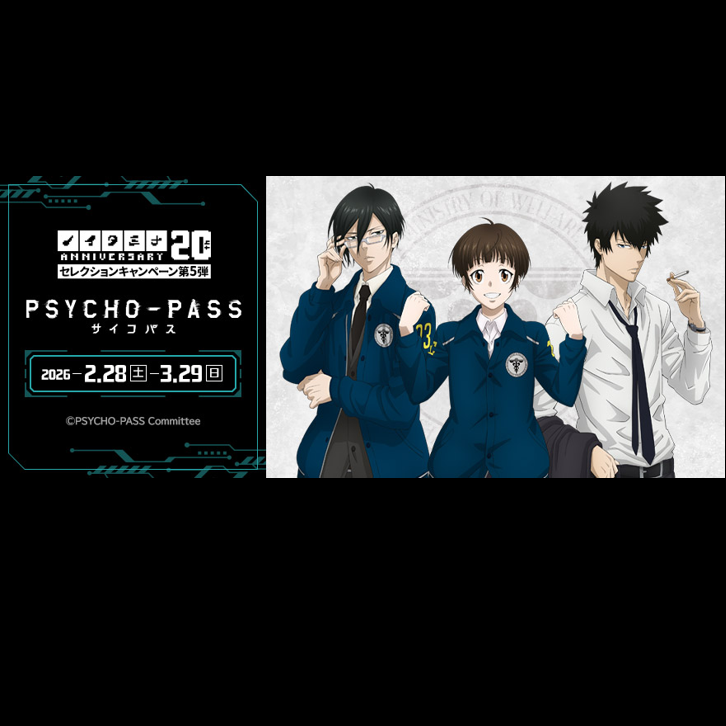 NEWS ニュース 2026.02.13 INFO “ノイタミナ”20周年記念!ノイタミナショップ&カフェシアターとFC連動施策決定! 2026.02.06 INFO 【重要】『PSYCHO-BOX』サービスクローズのお知らせ 2026.02.03 INFO 『PSYCHO-PASS サイコパス』× 『オーダースーツブランドDIFFERENCE』 コラボ第二弾決定! VIEW ALL SPECIAL CONTENTS スペシャルコンテンツ VIEW ALL SERIES シリーズ